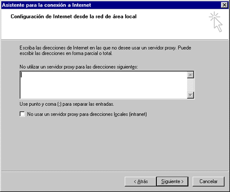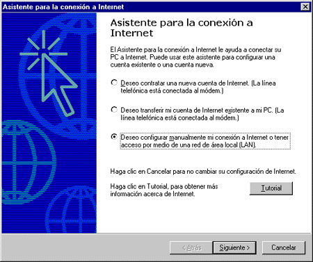 Los siguientes pasos muestran cómo configurar el navegador de Microsoft Explorer para poder accesar a internet usando WinGate. Para configurarlo bastará con seguir los siguiente pasos: 1. Abrir el Asistente para la conexión a internet y elegiremos la opción de configurar manualmente la conexión a internet o por medio de una LAN.