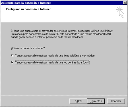 2. Ahora nos preguntará como nos conectaremos a internet. Seleccionar la opción de "Tengo acceso a internet por medio de una red de área local (LAN)".