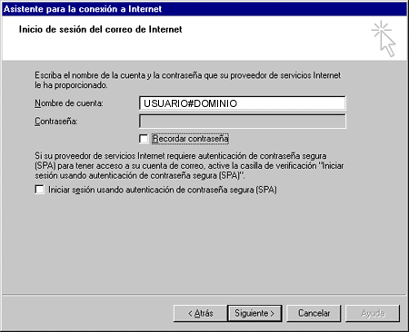 6. En el siguiente paso necesitas teclear tu nombre de usuario seguido de el carácter # y este seguido del dominio. Los demás campos vacíos.