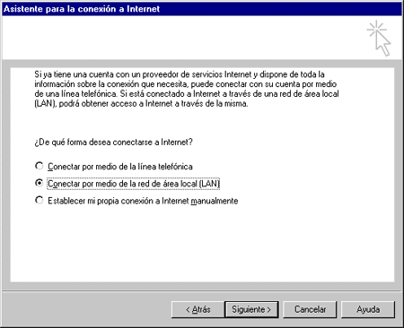 7. Seleccionar el tipo de conexión "Conectar por medio de la red de área local (LAN)".