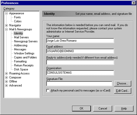 4. En el apartado de Correo y Grupos seleccione la opción de "Identidad" y capture los siguientes campos: