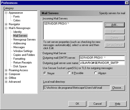| Configuración de Correo Electrónico Netscape Communicator Messenger (Netscape v4.x) accesando a través de una Red de área local (WINGATE) | ||