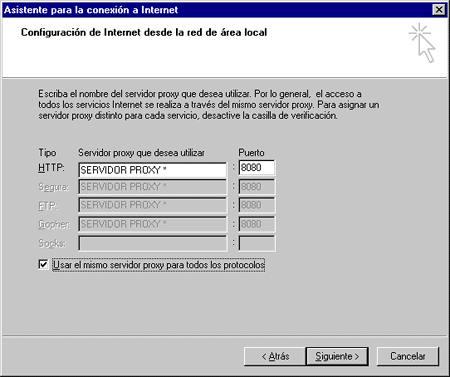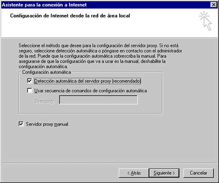 Los siguientes pasos muestran cómo configurar el navegador de Microsoft Explorer para poder accesar a internet usando WinGate. Para configurarlo bastará con seguir los siguiente pasos: 1. Abrir el Asistente para la conexión a internet y elegiremos la opción de configurar manualmente la conexión a internet o por medio de una LAN.