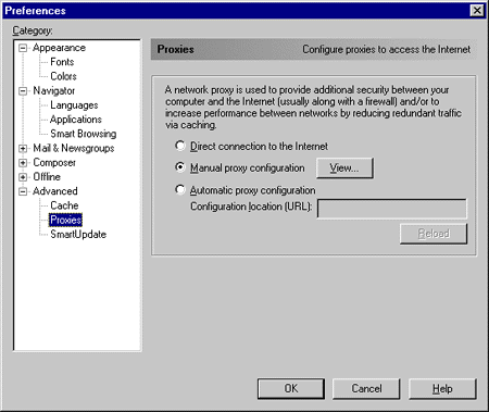 Los siguientes pasos muestran cómo configurar el navegador de Nestcape para poder accesar a internet usando WinGate. 1. Inicie el navegador Netscape y marque la opción de "Preferencias" del menú Editar. 2. Nos aparecerá la ventana de preferencias. Aquí elija la categoría "Avanzada" del menú Categoría y en la siguiente ventana elegir el submenu de proxies.